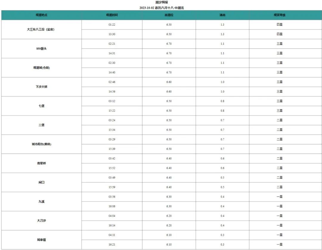 (观潮点的观赏性参考观赏等级:一星无观赏性,二星观赏性较差,三星观赏性一般,四星观赏性较好,五星观赏性好。因钱塘江涌潮受天文、气象、上游来水、江道地形等多种因素共同影响,以上预测仅供参考;观潮请提前1小时候潮,并注意安全。)