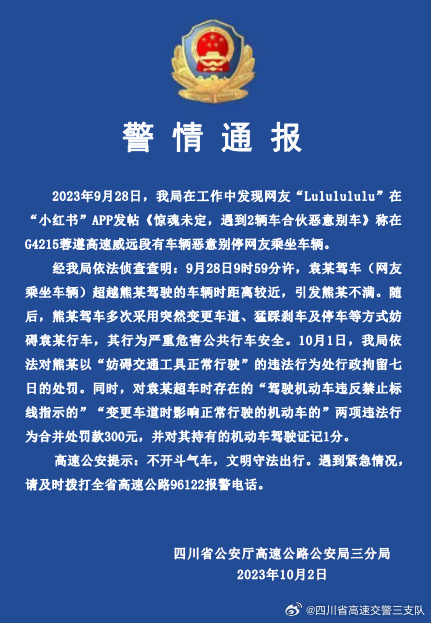 经我局依法侦查查明: 9月28日9时59分许,袁某驾车(网友乘坐车辆)超越熊某驾驶的车辆时距离较近,引发熊某不满。随后,熊某驾车多次采用突然变更车道、猛踩刹车及停车等方式妨碍袁某行车,其行为严重危害公共行车安全。10月1日,我局依法对熊某以“妨碍交通工具正常行驶”的违法行为处行政拘留七日的处罚。同时,对袁某超车时存在的“驾驶机动车违反禁止标线指示的”“变更车道时影响正常行驶的机动车的”两项违法行为合并处罚款300元,并对其持有的机动车驾驶证记1分。