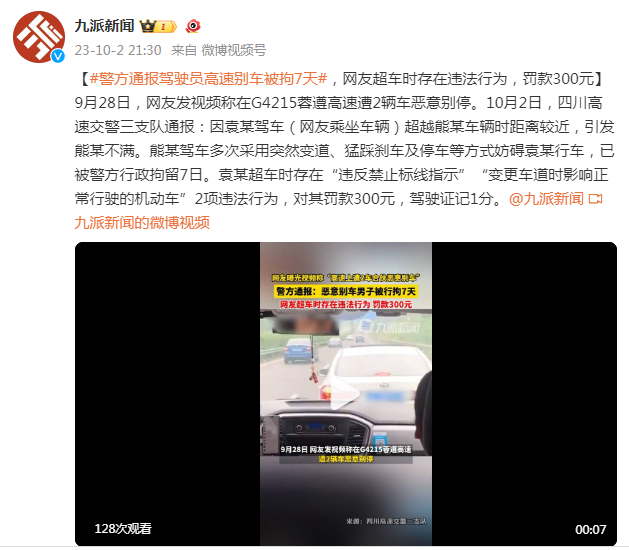 9月28日,网友发视频称在G4215蓉遵高速遭2辆车恶意别停。10月2日,四川高速交警三支队通报:因袁某驾车(网友乘坐车辆)超越熊某车辆时距离较近,引发熊某不满。熊某驾车多次采用突然变道、猛踩刹车及停车等方式妨碍袁某行车,已被警方行政拘留7日。袁某超车时存在“违反禁止标线指示”“变更车道时影响正常行驶的机动车”2项违法行为,对其罚款300元,驾驶证记1分。