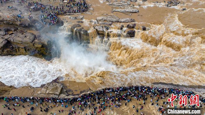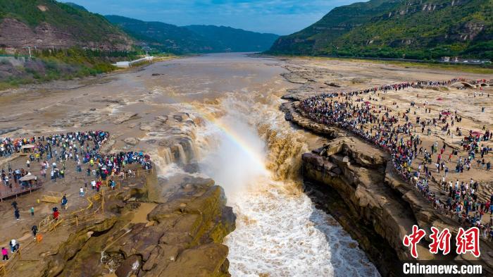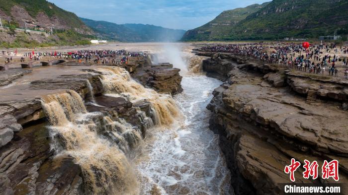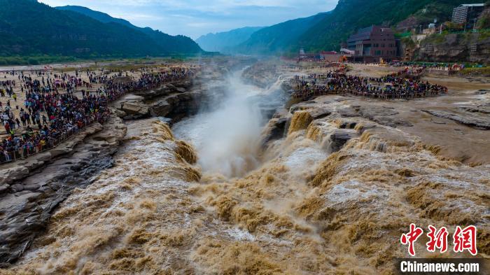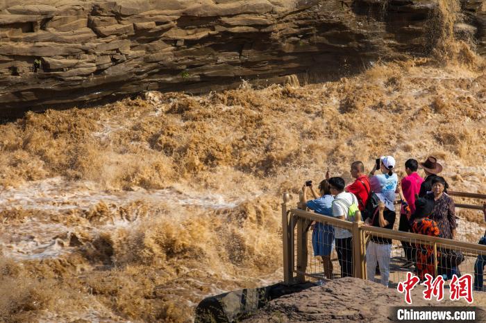 中秋国庆假期,位于秦晋峡谷的黄河壶口瀑布水流持续上涨,滔滔黄河水涌至秦晋峡谷,跃进壶底,出现浊浪滔天、金流飞瀑景观,吸引游客拍照留念。