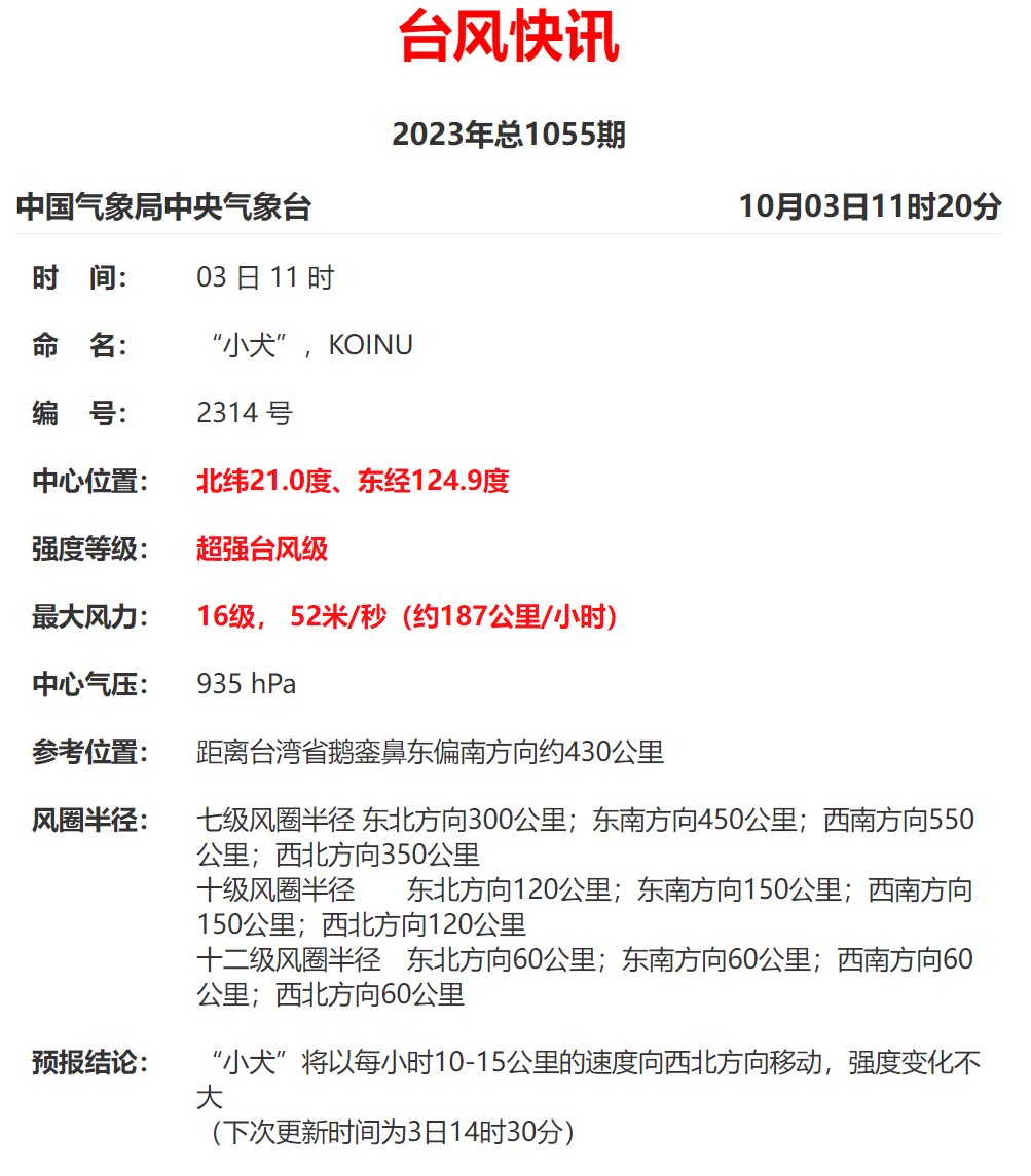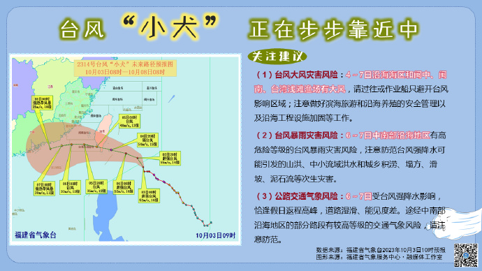 预计,“小犬”将以每小时10-15公里的速度向西北方向移动,逐渐向台湾岛南部沿海靠近,强度变化不大,4日夜间至5日早晨将登陆或擦过台湾岛南部沿海(强台风级,45-50米/秒,14-15级), 之后向偏西方向移动,强度逐渐减弱。