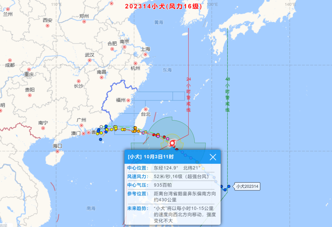 3日14时至4日14时,东海南部及钓鱼岛附近海域、台湾以东洋面、巴士海峡、台湾海峡、南海东北部以及浙江沿海、福建沿海、台湾岛沿海将有6-8级大风,台湾岛东南部海面的风力将有9-12级,“小犬”中心经过的附近海面风力可达13-16级,阵风17级。