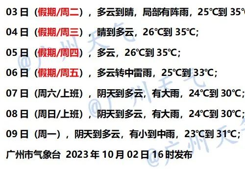 10月4日,大部分市县晴到多云,局部有(雷)阵雨。最高气温:大部分市县32℃~34℃,部分市县35℃~36℃。