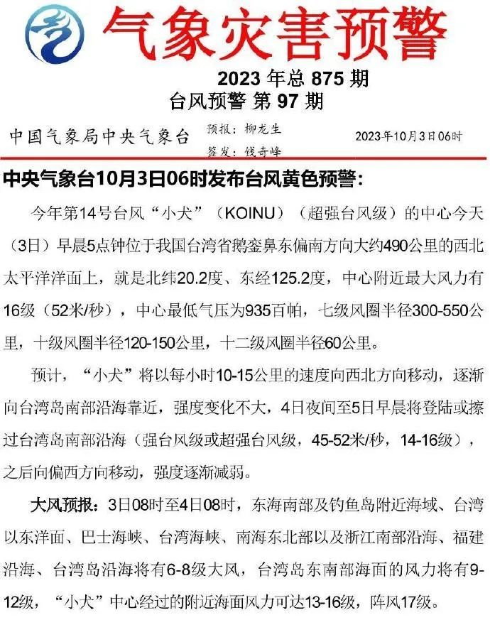 中央气象台3日6时发布台风黄色预警 ,