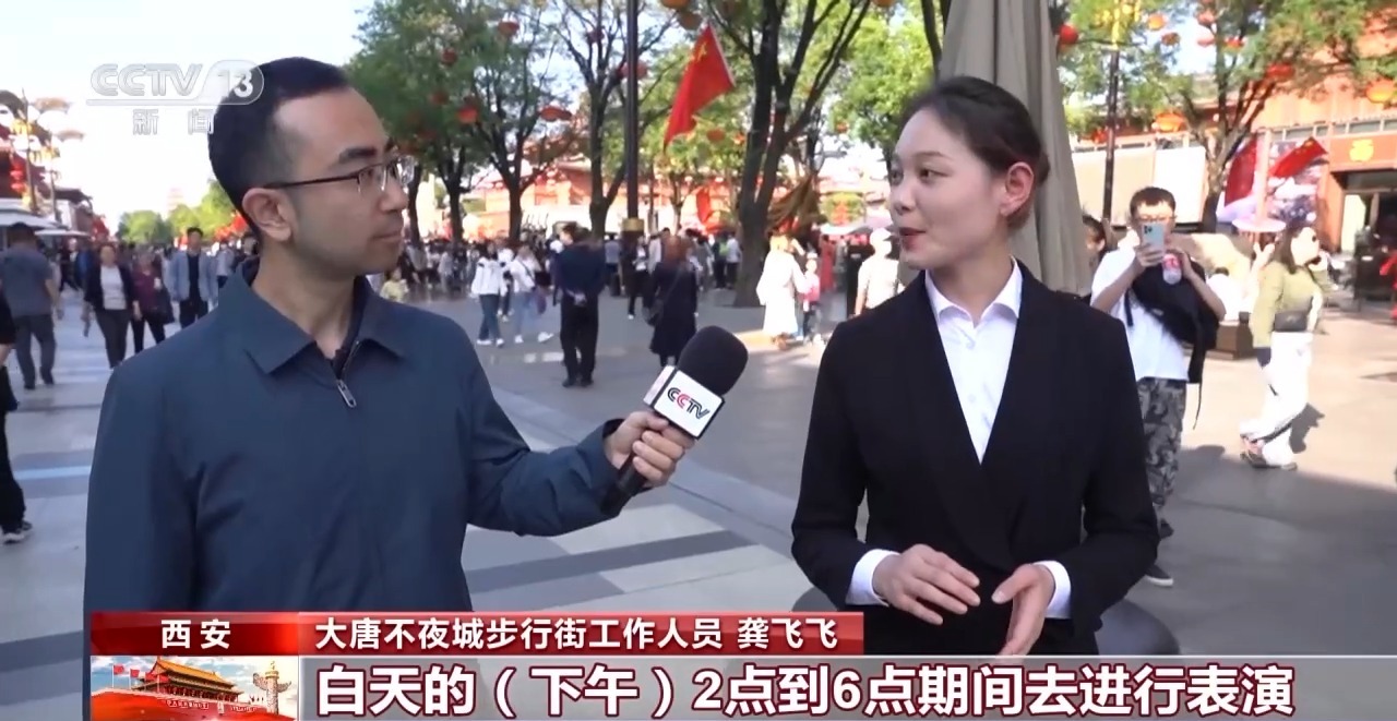 大唐不夜城步行街工作人员 龚飞飞:双节期间,我们把整条街区的演出全部调整到白天的(下午)2时到6时期间去进行表演,一方面减轻大唐不夜城的客流压力,也让整条步行街给到很多游客不一样的体验感。