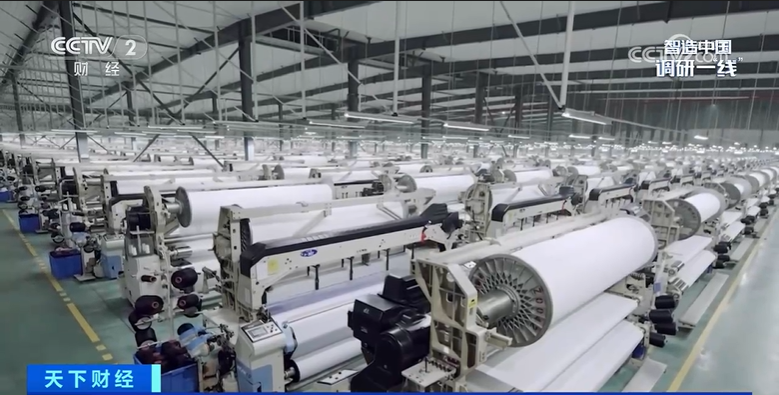 丝要经纬交织才成布匹。全新一代喷水织机,一天可以织布300米,效率是传统人工的30倍左右,之后再进行染色、印花等后加工程序,就是成品的布匹。