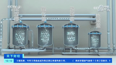 一滴油如何变成一块布?首先原油通过海运,来到大连长兴岛的石化基地,通过炼油装置,经过加氢、蒸馏等一系列化学反应,生成聚酯原材料。之后进入苏州化纤工厂进行混合,就像面粉和水一样,聚合成透明黏稠的液体,冷却后切成小颗粒。这时候,它的黏度是0.67分升每克左右,还远远达不到工业丝的要求,还需进一步历练。