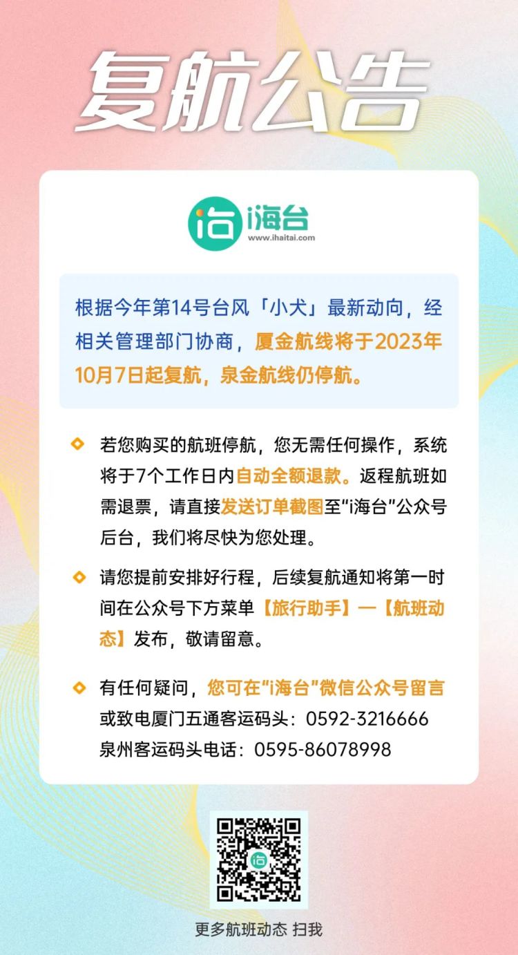根据今年第14号台风“小犬”最新动向,邮轮中心厦鼓码头海上风力仍较强,鹭江道轮渡码头海上风力逐步减弱,经市防指组织海事、港口、文旅、气象等部门会商同意,为满足游客上鼓浪屿岛需求,2023年10月6日13:00起开通鹭江道轮渡码头—鼓浪屿三丘田码头临时游客航线,其他航线预计明天上午可以复航,具体时间另行通知。