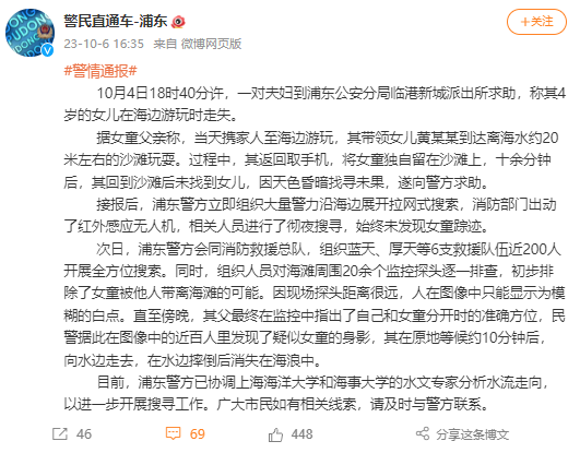 接报后,浦东警方立即组织大量警力沿海边展开拉网式搜索,消防部门出动了红外感应无人机,相关人员进行了彻夜搜寻,始终未发现女童踪迹。