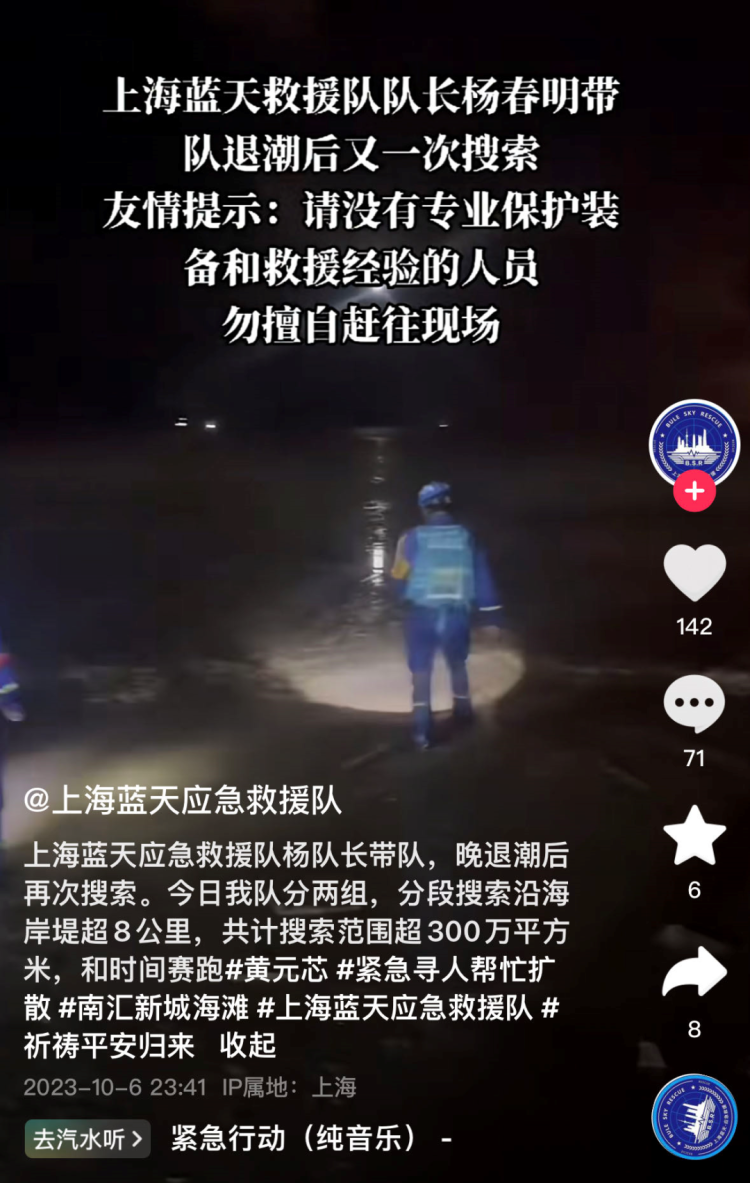 上海蓝天应急救援队搜救人员介绍,10月5日中午接到求助信息,和家属沟通后启动应急预案,海滩边进行搜找,搜找的范围是事发地周围3公里区域。网友发的图片线索搜救人员也一直在关注着,根据这些照片获得了更多信息。