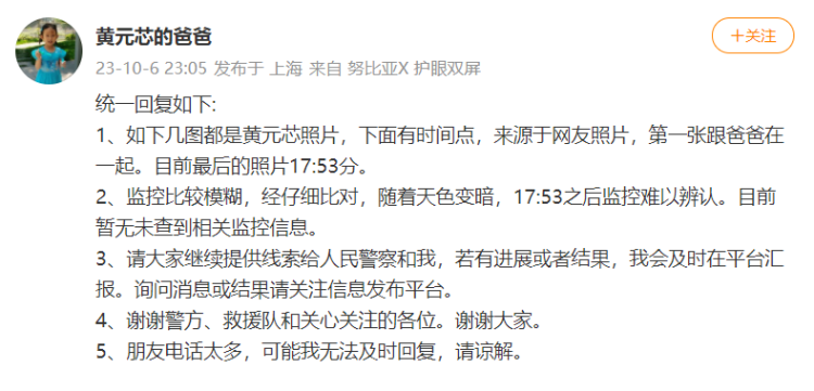 10月6日深夜,@黄元芯爸爸 公布了多张带时间点标注的照片,称都是走失女童黄元芯的照片,来源于网友提供的线索。