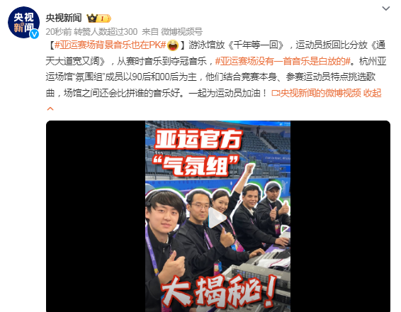 游泳馆放《千年等一回》,运动员扳回比分放《通天大道宽又阔》,从赛时音乐到夺冠音乐,亚运赛场没有一首音乐是白放的。杭州亚运场馆“氛围组”成员以90后和00后为主,他们结合竞赛本身、参赛运动员特点挑选歌曲,场馆之间还会比拼谁的音乐好。一起为运动员加油!