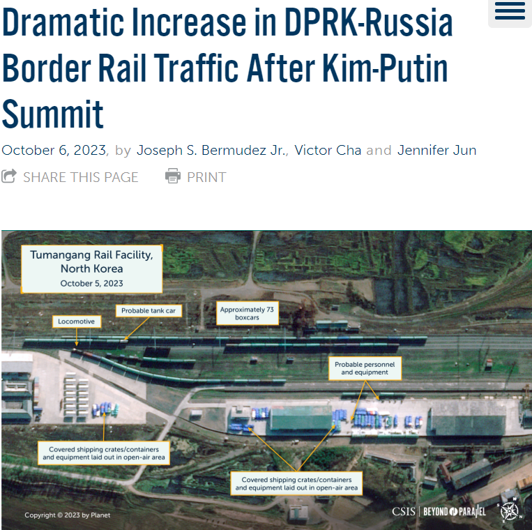 报告猜测,这一系列活动“可能表明朝鲜在向俄罗斯供应武器和弹药”。不过报告也承认,无法确定车厢内的物品。