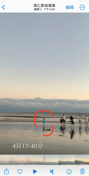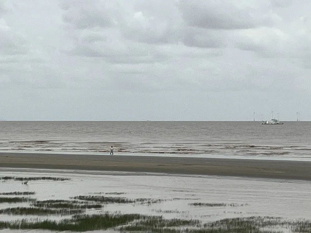 视频中有一个模糊的人影,疑似穿着蓝色裙子,独自在海边滩涂上行走。
