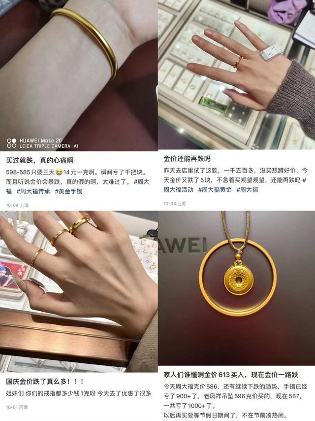 今年9月,多品牌饰品金价突破每克600元大关后持续走高,9月下旬,周大福(01929.HK)、六福珠宝(00590.HK)等品牌的金价更是一度涨至每克615元。不过,中秋国庆假期,品牌店饰品金价出现回落,每克跌破590元。