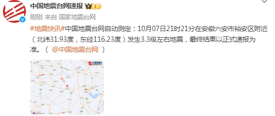 中国地震台网自动测定:10月07日21时21分在安徽六安市裕安区附近(北纬31.93度,东经116.23度)发生3.3级左右地震,最终结果以正式速报为准。