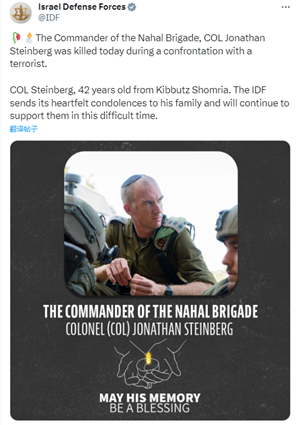 【环球网报道】巴勒斯坦伊斯兰抵抗运动(哈马斯)7日清晨从加沙地带向以色列发起近年来最大规模火箭弹袭击,局势一触即发为全面冲突。据《以色列时报》8日消息,以色列国防军透露,以军纳哈尔步兵旅指挥官、42岁的上校乔纳森·斯坦伯格在前往与哈马斯战斗现场途中被“恐怖分子”杀害。