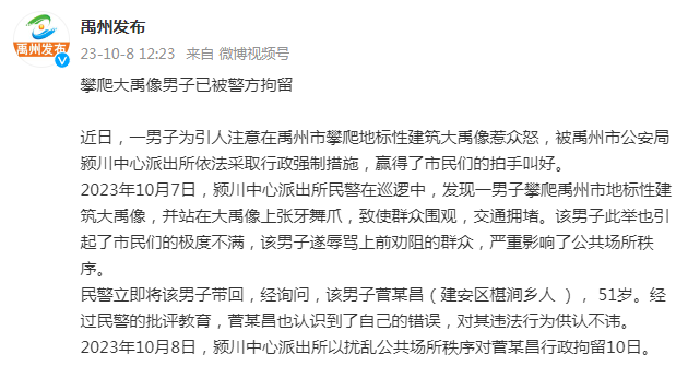 近日,一男子为引人注意在禹州市攀爬地标性建筑大禹像惹众怒,被禹州市公安局颍川中心派出所依法采取行政强制措施,赢得了市民们的拍手叫好。