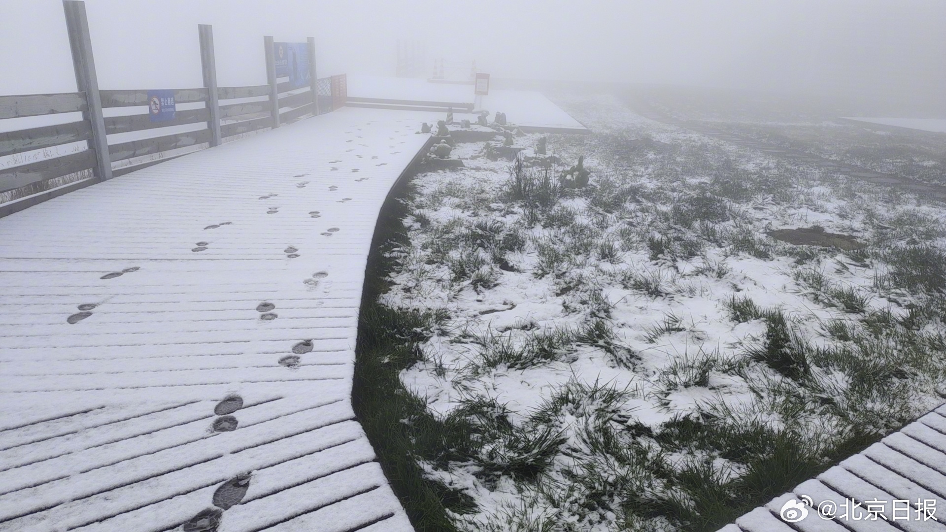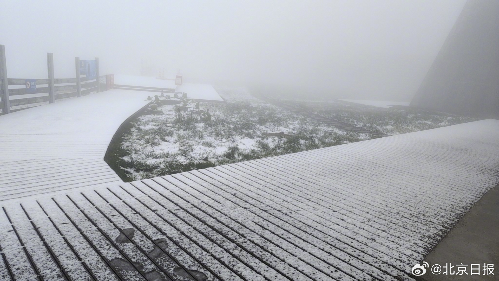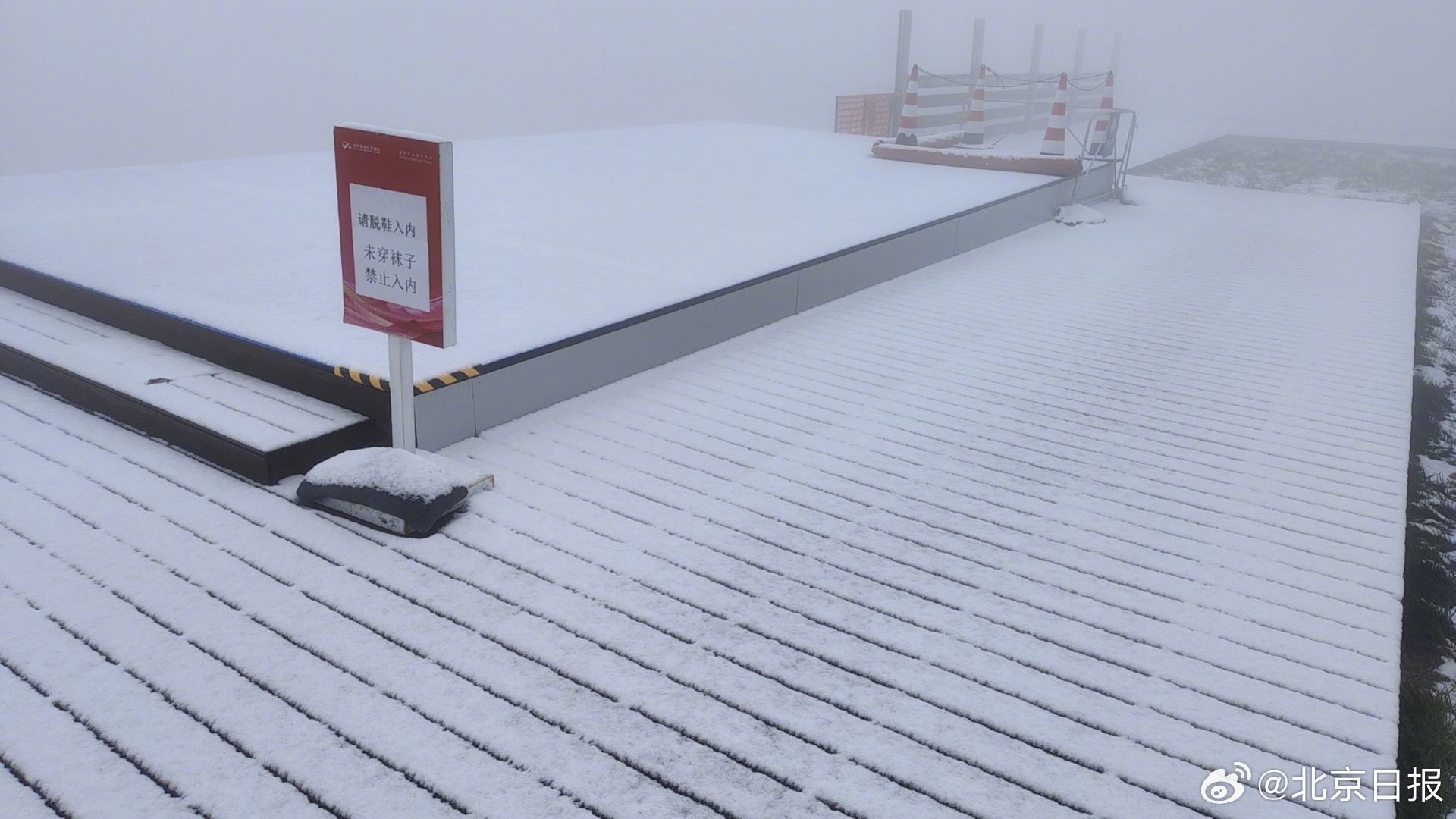 10月7日夜间,北京市延庆区出现小雨天气,在高海拔地区,雨滴化为片片白雪。8日8时,海陀山巅、延庆奥林匹克园区山顶出发区已覆盖上了一层薄雪,仿佛披上一层白纱。(@北京日报 记者 李瑶/延庆奥林匹克公园供图)