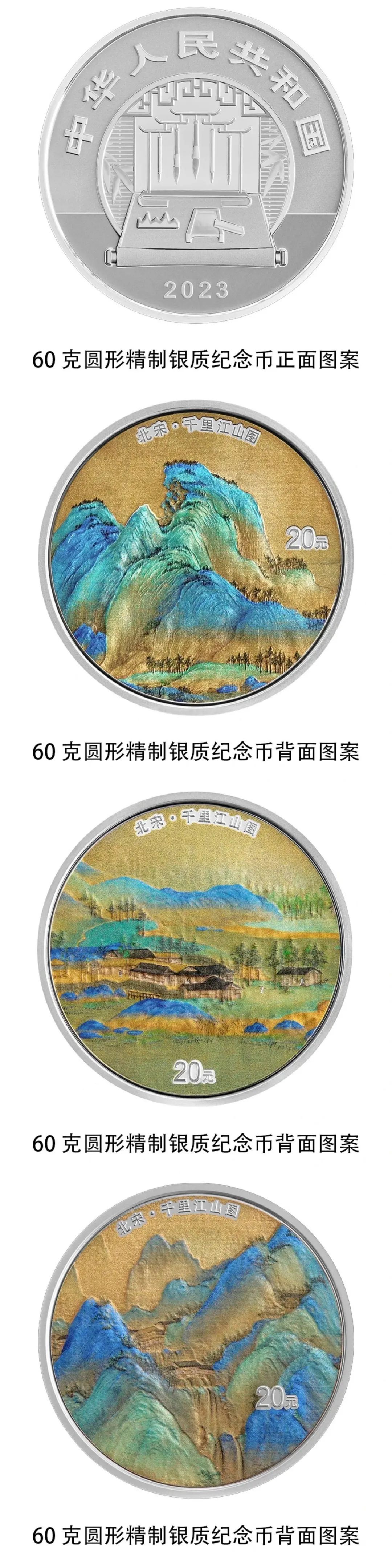 4枚圆形金银纪念币正面图案均为笔、墨、纸、砚造型,辅以竹叶、窗等装饰组合设计。背面图案均为《千里江山图》局部场景,并刊“北宋·千里江山图”字样及面额,其中,50克圆形金质纪念币为精制币,含纯金50克,直径40毫米。面额800元,最大发行量1000枚。60克圆形银质纪念币为精制币,含纯银60克,直径45毫米,面额20元,最大发行量3×8000枚。