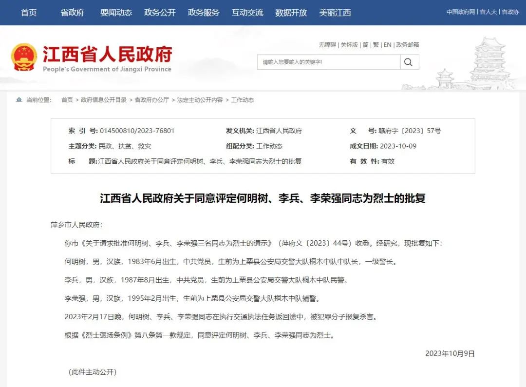10月10日,江西省人民政府同意评定何明树、李兵、李荣强同志为烈士。