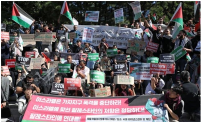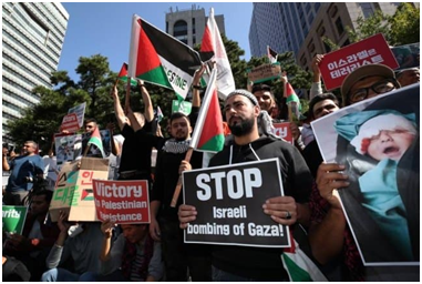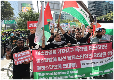 【环球网报道 见习记者 姜蔼玲】韩联社11日报道称,当天下午,居住在韩国的巴勒斯坦人和阿拉伯人当天在首尔市中心举行集会,抗议以色列对加沙地带轰炸和实施“全面封锁”。他们手持标语牌,上面写着“停止以色列对加沙地带的轰炸”,同时高喊“解放巴勒斯坦”口号。