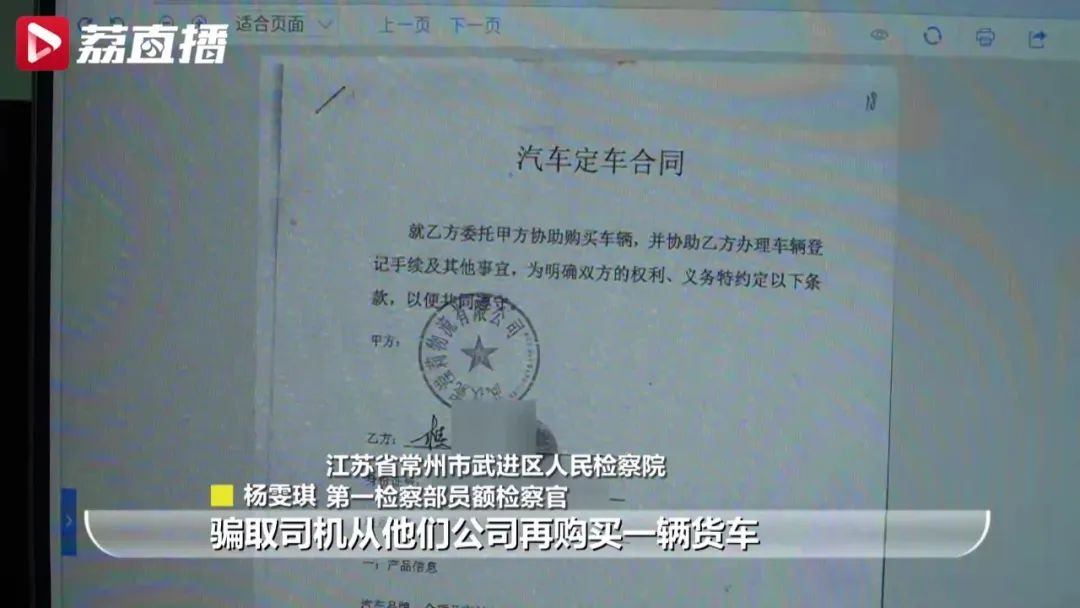 常州市武进区人民检察院第一检察部员额检察官杨雯琪介绍:“求职的时候,被害人被公司要求缴纳两万到两万五千元的加盟费 。没有车辆的驾驶员入职之后还需要购买一辆运输的货车,还会和公司签订委托购车协议。公司通过隐瞒真实车款的方式,骗取一部分车款的差价 。”