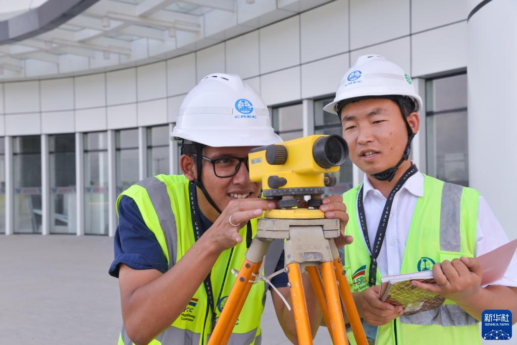 7月21日,在印度尼西亚万隆雅万高铁德卡鲁尔车站外,中铁四局雅万项目部印尼籍工程师斯万达鲁(左)向他的中国师傅学习水准测量。新华社记者 徐钦 摄