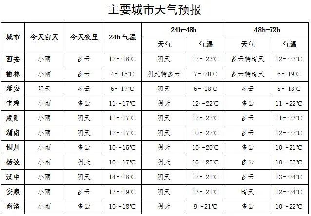 14日:全省多云转晴天。陕北西部部分、关中南部部分、陕南西部部分、秦巴山区局地有阵雨。夜间至清晨关中部分、陕南部分地方有雾或浓雾。