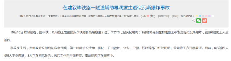 10月10日12时左右,由中铁十九局施工建设的叙毕铁路新高坡隧道(位于毕节市七星关区境内)1号辅助导洞在封堵施工中发生疑似瓦斯爆炸,造成6名施工人员被困。