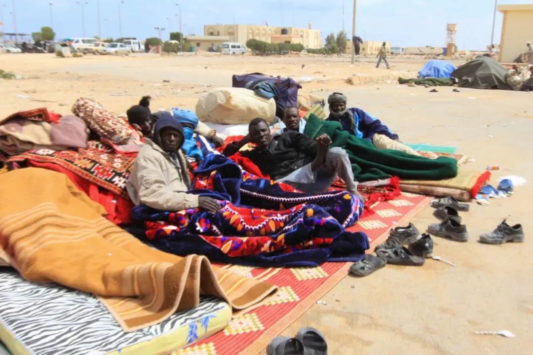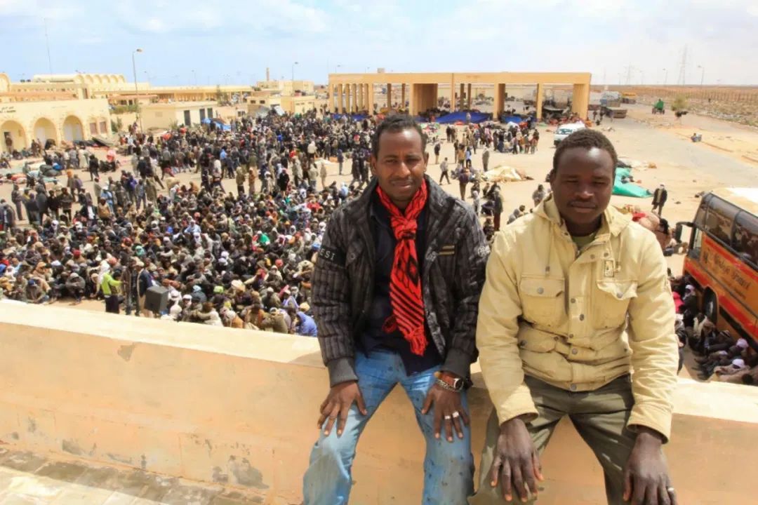 其中一个扎红围巾的男人,他原本在利比亚东部的城市班加西做服装生意,为了躲避战乱,一路向东来到埃及。许多人跟他一样,身无分文来到口岸,哪里也去不了,完全依仗国际组织和埃及政府的救助,已经在口岸呆了25天了。