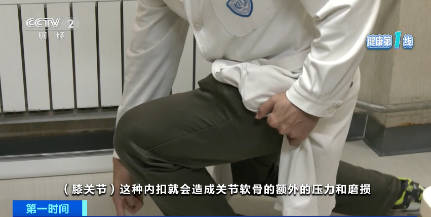 北京大学人民医院骨关节科副主任医师 刘强 :膝关节需要屈伸负重,像上下楼、蹲等活动的时候,膝关节内扣就会造成关节软骨的额外压力和磨损,通过正确的向前发力方式来屈伸,减少这种内扣、膝盖前冲,这样就能减少关节的磨损。