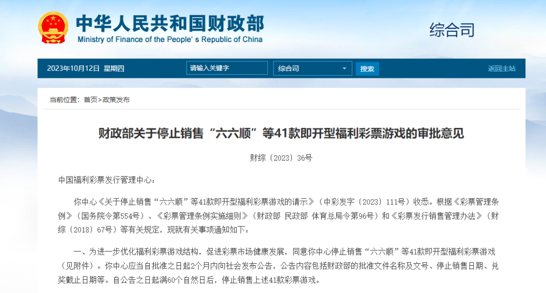 10月11日,财政部网站公布《关于停止销售“六六顺”等41款即开型福利彩票游戏的审批意见》(财综〔2023〕36号),批准中国福利彩票发行管理中心停止销售“六六顺”等41款即开型福利彩票游戏。