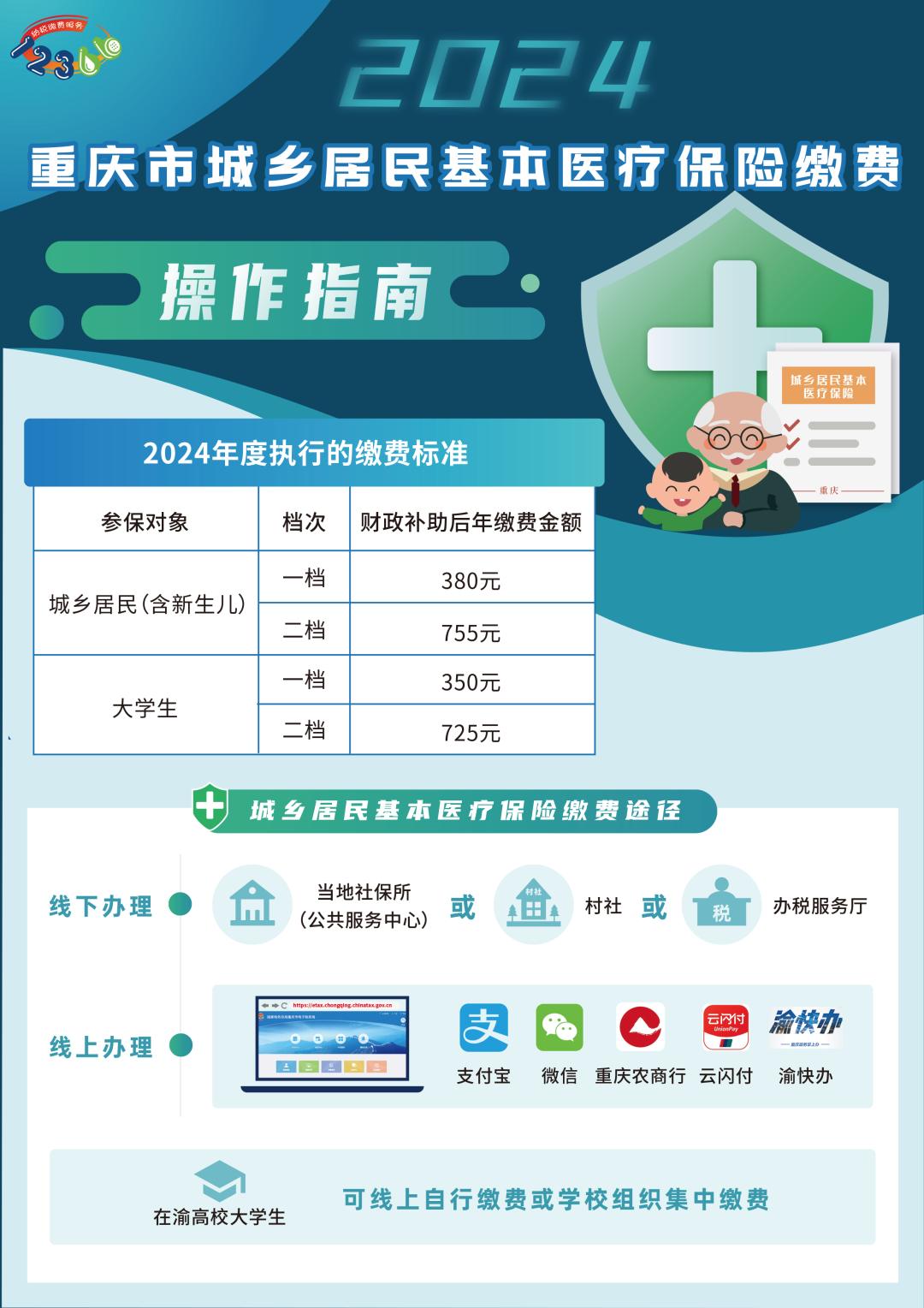 《通知》明确,重庆2024年度城乡居民医疗保险费的参保标准为:城乡居民个人缴费标准为一档380元/人·年,二档755元/人·年 ;在渝高校大学生(含全日制研究生)参加城乡居民基本医疗保险,缴费标准为一档350元/人·年、二档725元/人·年 。