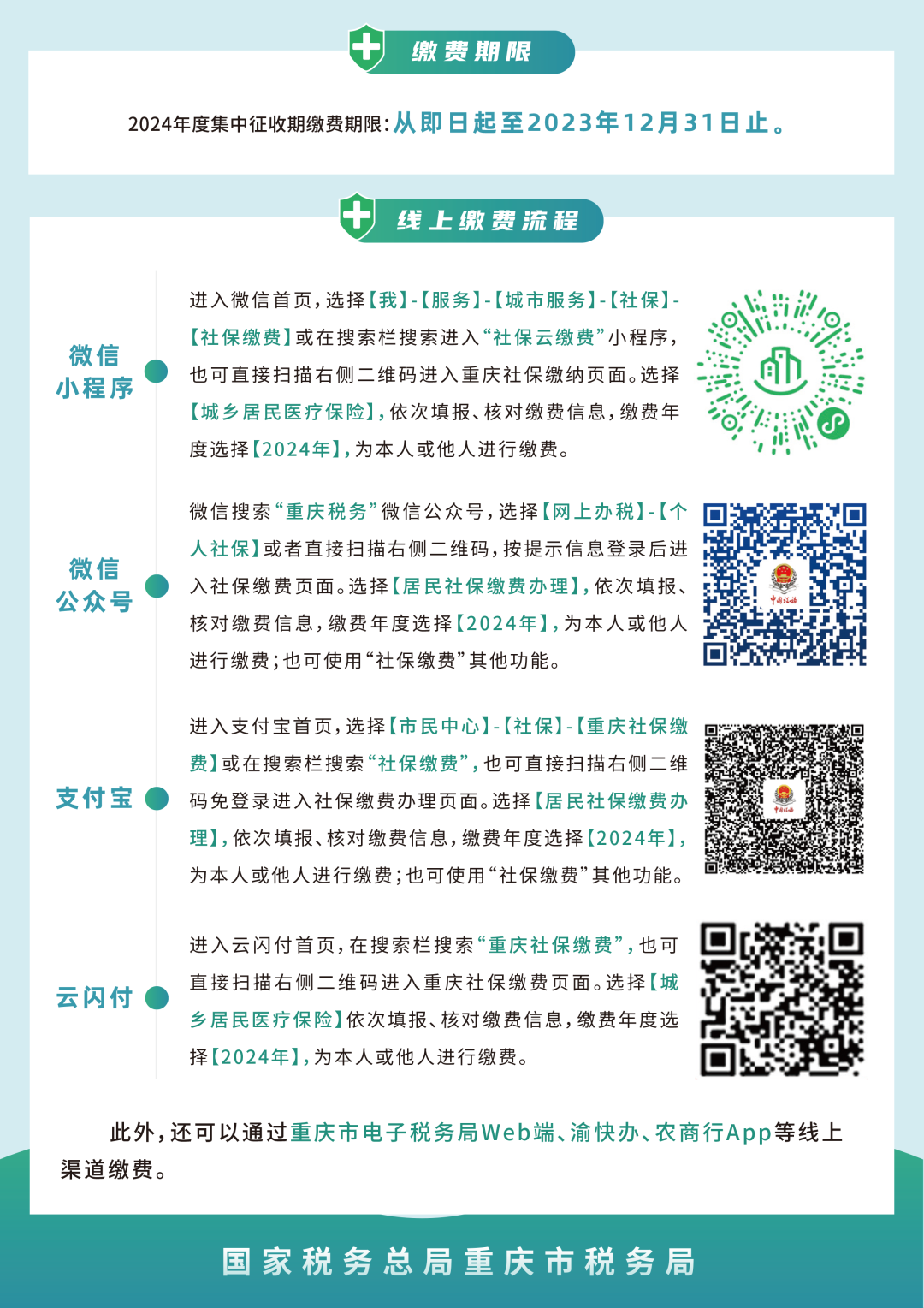 线上,可通过重庆市电子税务局、“重庆税务”微信公众号、“社保云缴费”微信小程序、渝快办、支付宝、云闪付 进行参保缴费。其中,“社保云缴费”微信小程序和支付宝可免登录直接进行缴费。