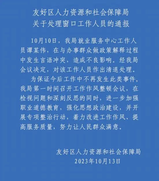 10月13日,黑龙江伊春市友好区人社局就此事发布一则通报: