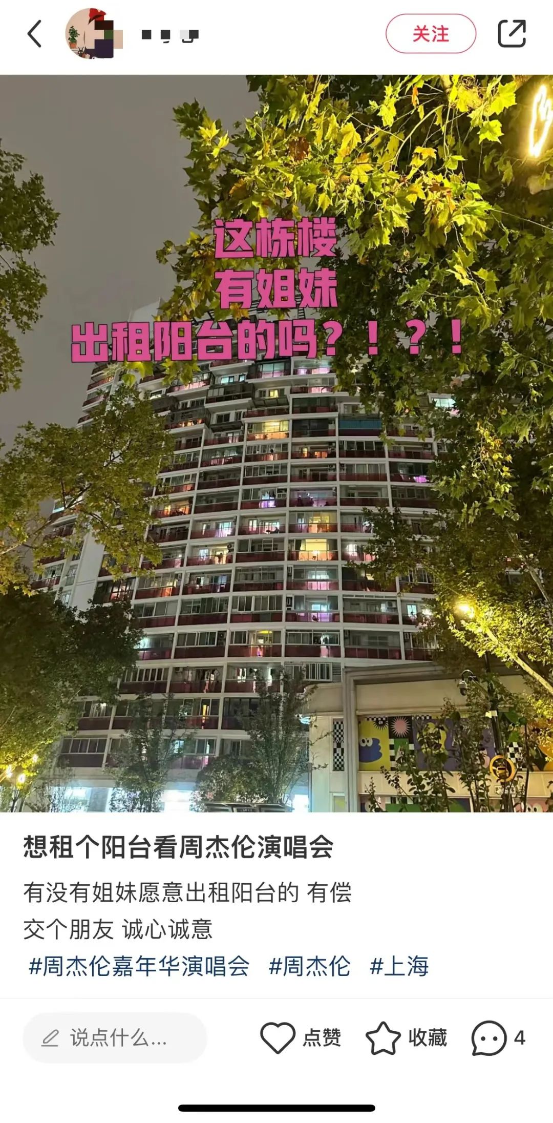 有网友发帖询问“有哪位好心人把阳台租给我看周杰伦演唱会吗”,配上上海体育场附近亮灯的居民楼。有人发帖称300元卖一张“阳台票”,也有人开价160元,还有卖票时限女性购买等要求。事实上,“阳台票”的帖子中不乏开玩笑的人,但也有人是认真的。