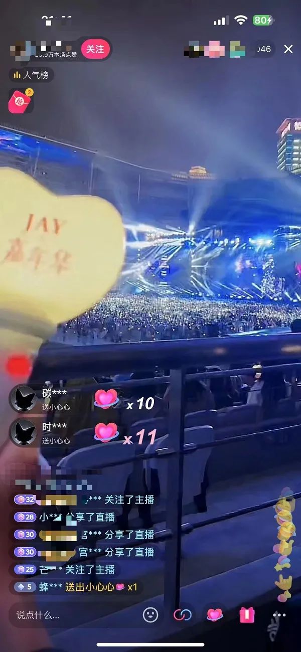 这只是一个直播间里的数据。记者浏览多个小视频平台,发现这一现象绝非“孤例”。有视频博主在上海体育馆外“蹲点”直播听歌的;有进入现场,在中段或者偏后位置开启“氛围组”的,也有直接在自家阳台上“开直播”的……