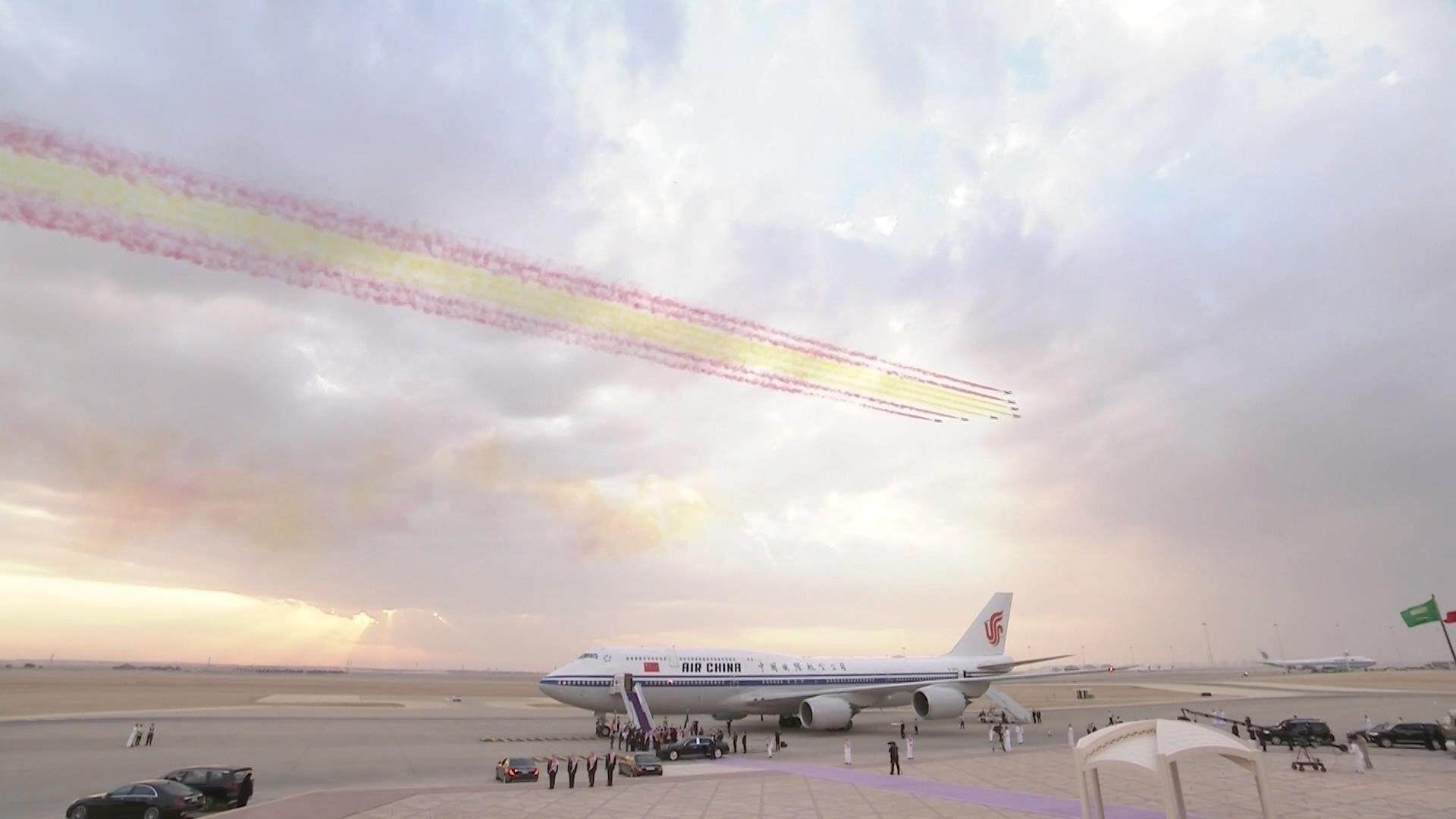 过去7年,在两国元首共同推动下,中沙务实合作迅猛发展。2022年12月,时隔6年,习近平主席对沙特再次进行国事访问。当习近平主席乘坐的专机进入沙特领空,沙特空军4架战机升空护航,礼宾护卫机在空中拉出象征中国国旗的彩带,沙特用最高礼遇迎接来自中国最尊贵的客人。