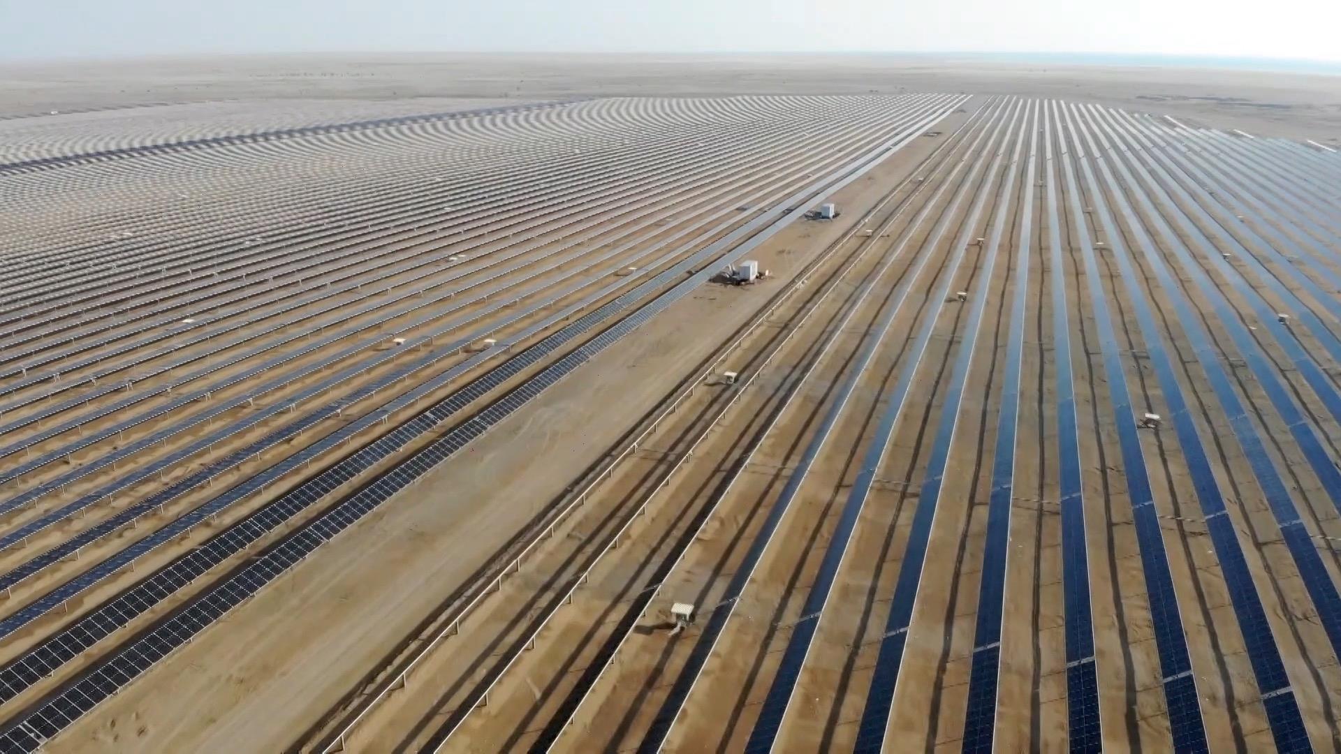 红海之滨,中沙正携手在沙漠里打造一座未来之城。红海新城,是中沙在绿色低碳领域重点合作项目,未来这里的电力供应将100%来自清洁能源。在中国企业建设的其中一个光伏厂区内,4068排光伏板整齐排列,24小时不间断为新城提供可再生能源。针对当地沙尘频繁的天气,中国企业还专门设计了自动清扫机器人。