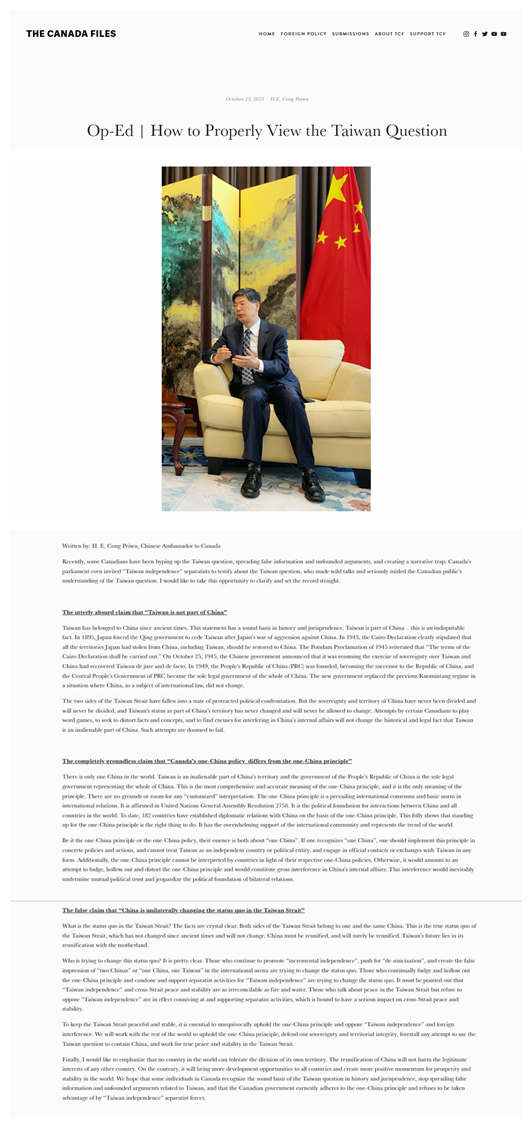 2023年10月13日,驻加拿大大使丛培武在“加拿大档案”网站发表题为《如何正确看待台湾问题》的署名文章。全文如下: