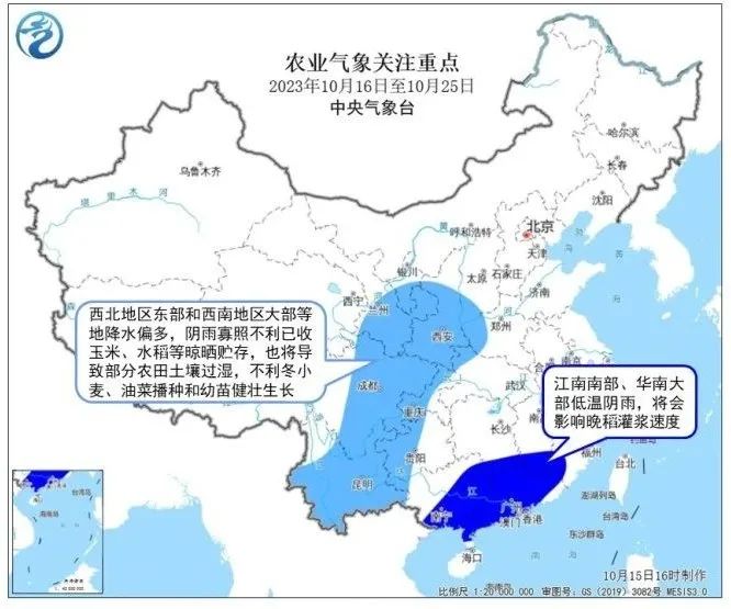 江南南部、华南大部气温较常年同期偏低1至2℃,降水偏多,低温阴雨天气将会影响晚稻灌浆速度。西北地区东部和西南地区大部降水偏多,多雨寡照不利已收玉米、水稻等晾晒贮存,也将导致部分农田土壤持续过湿,不利冬小麦、油菜播种和幼苗健壮生长,秋收秋种进度将延缓。