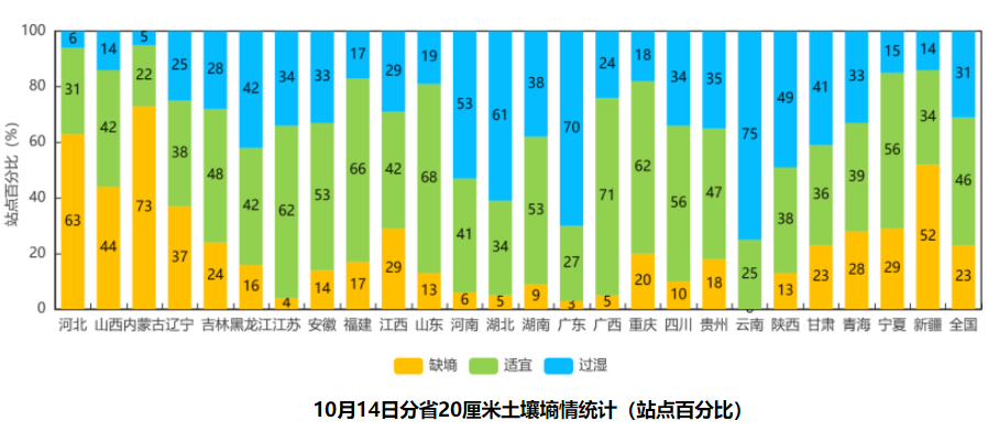 新疆大部、陕西大部、华北、黄淮、江淮大部、江汉以晴好天气为主,特别是前期多雨的陕西中南部、河南中西部、湖北中西部农区农田过湿状况得到改善,利于加快玉米、大豆、花生等秋收作物成熟收晒和棉花吐絮采摘进度及秋种展开。