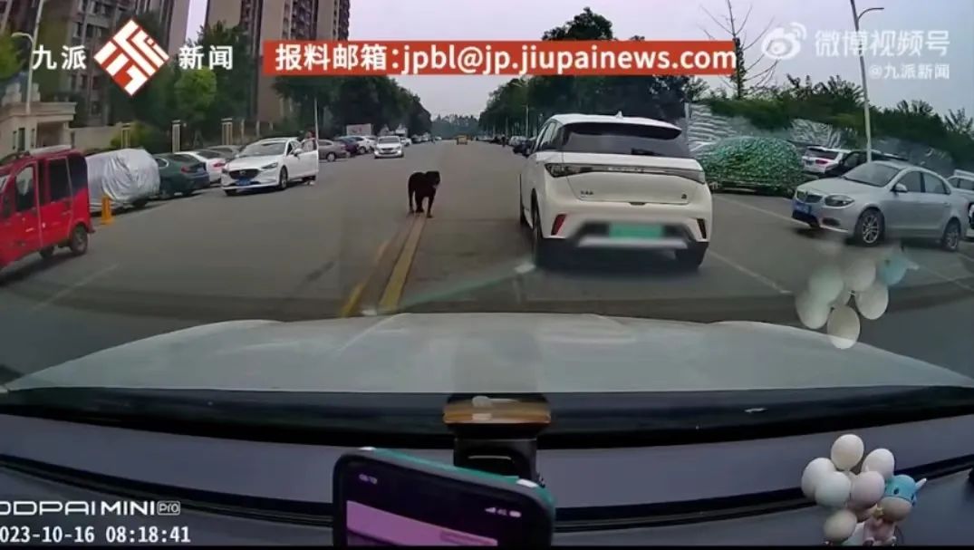 据网友发布的一段行车记录仪画面显示,事发不久后,疑似咬人黑犬逃离小区穿越马路。