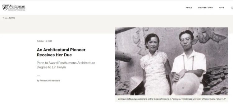 15日,美国宾夕法尼亚大学斯图尔特·韦茨曼设计学院官网宣布,此前曾在该校就读的中国著名建筑学家林徽因将被追授建筑学学位。