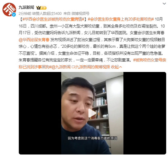 10月16日,四川成都。崇州一小区有大型犬撕咬幼童,致其全身多处咬伤及右肾挫裂伤。10月17日,受伤幼童妈妈告诉九派新闻,女儿目前转到了华西医院。女童会诊医生朱育春发布视频讲述了救治女童过程,其表示看了大狗撕咬女童的视频触目惊心,心情也有些忐忑,“20多处的撕咬伤,最长的有8cm,真是让我这个两个娃的老爹不忍直视”。据其介绍,女童生命体征平稳,目前,各项指标并没有出现严重的危急值。朱育春提醒各位有狗宝宝的家长,一定一定要牵绳,不让悲剧重演。