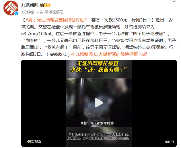 近日,安徽芜湖。交警在检查中发现一摩托车驾驶员涉嫌酒驾,呼气检测结果为63.7mg/100ml。在进一步核查过程中,男子一会儿称有“四个轮子驾驶证”、“刚考的”,一会儿又表示自己正在考科目三。当交警质问他没有驾驶证时,男子脱口而出:“我爸有啊!”目前,该男子因无证驾驶、酒驾被处1500元罚款、行政拘留3日。