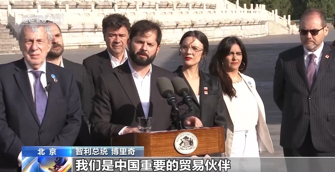 今天(18日)早上,智利总统博里奇参观了北京天坛公园,并向智利国内发表电视直播讲话和回答现场记者提问。