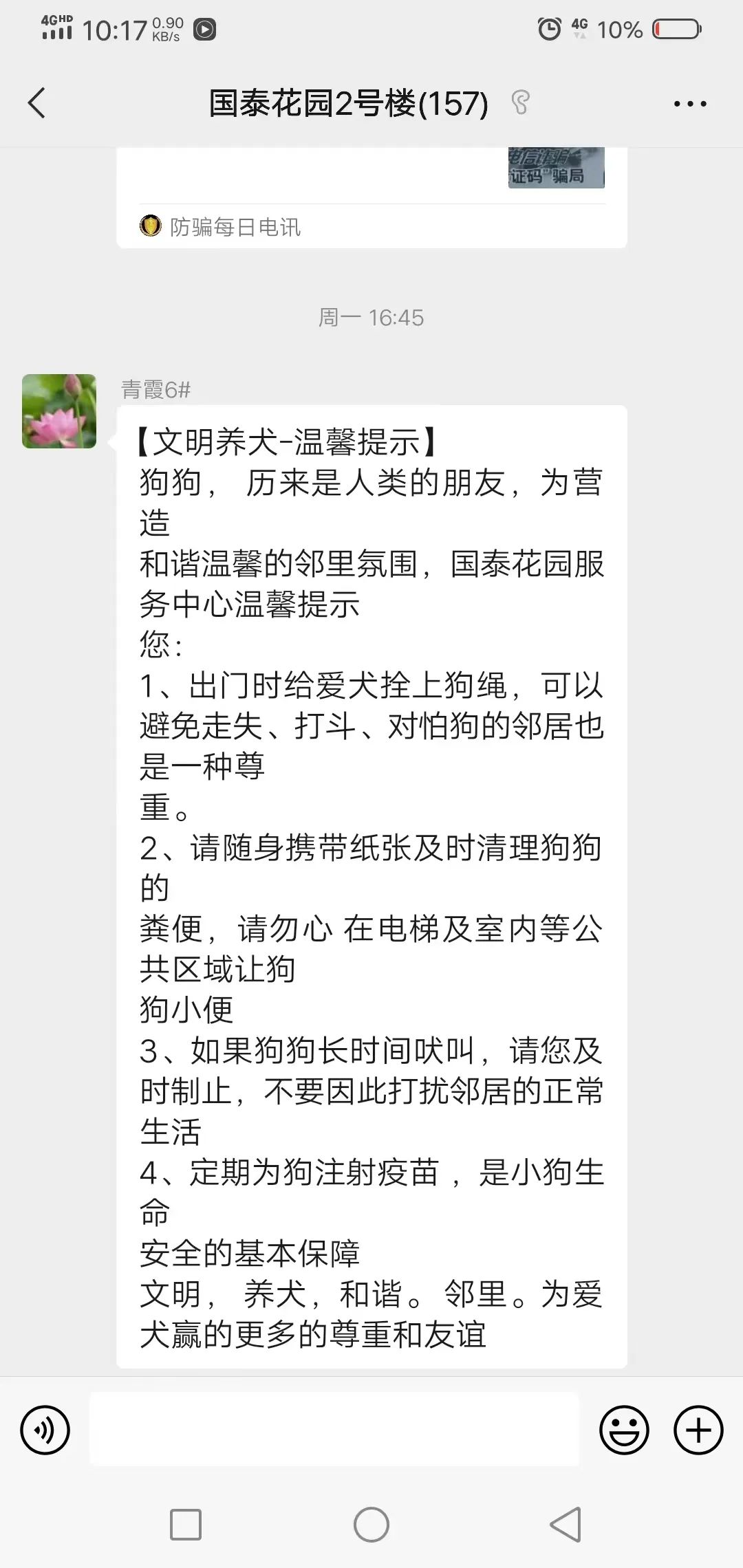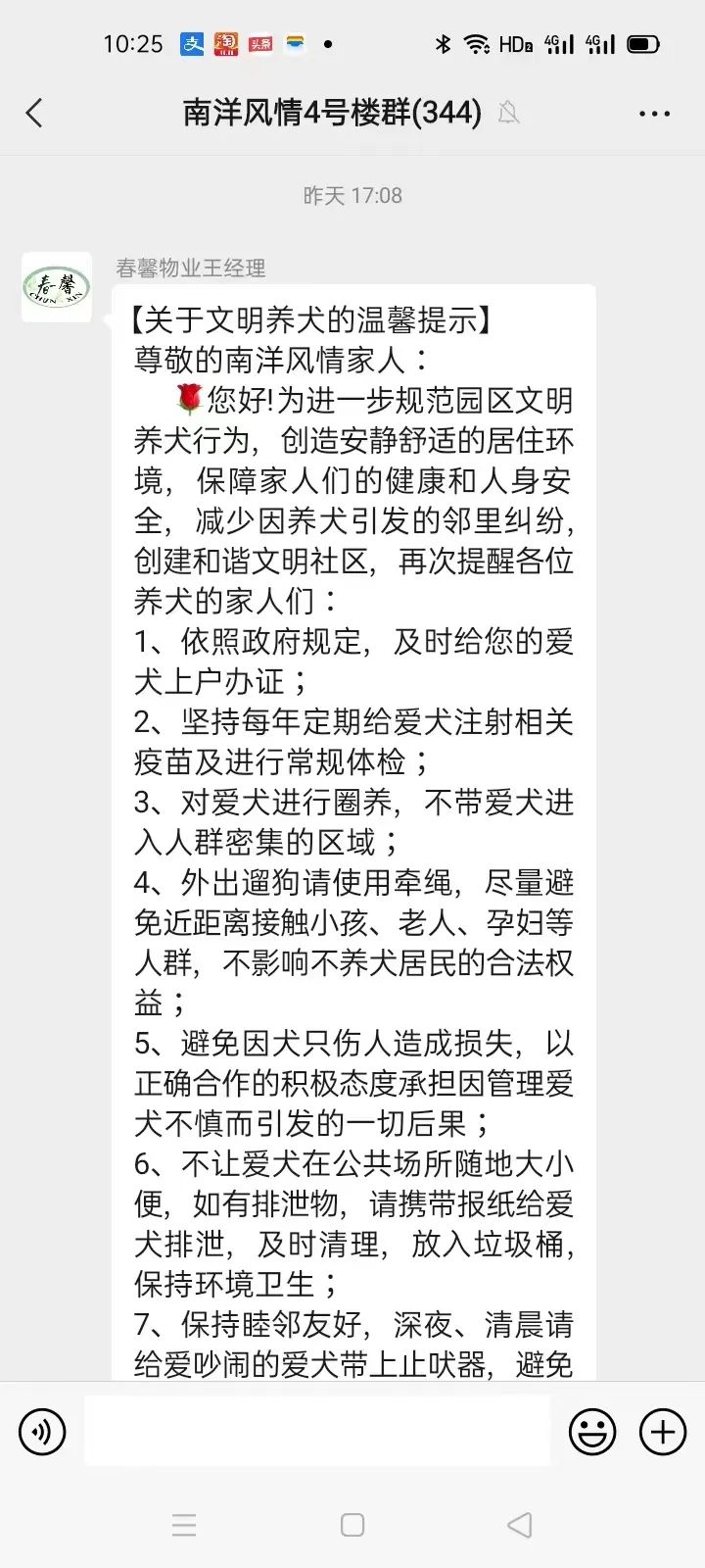 除了上述小区,康宁·南洋风情的小区业主彭女士也向顶端新闻记者证实,自成都事件发生后,10月17日,物业在业主群里发布了文明养犬的提示。