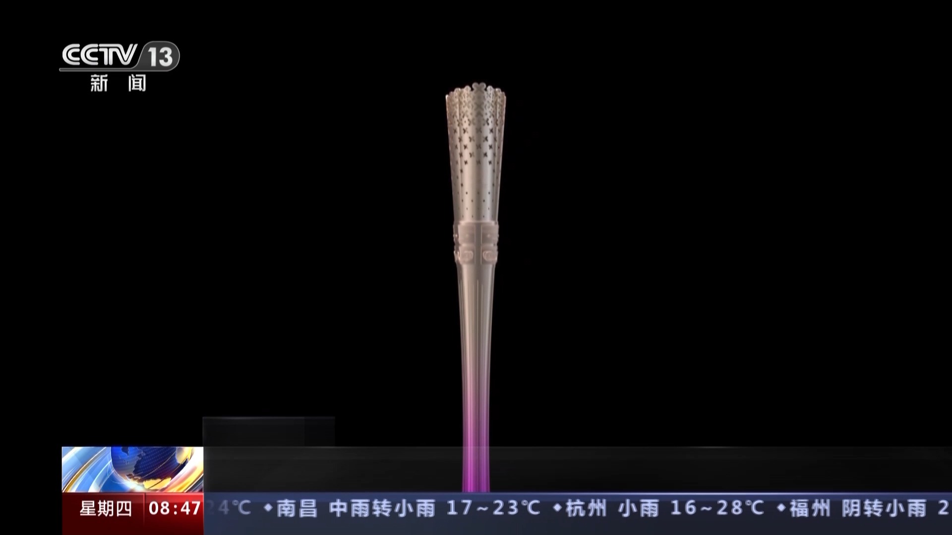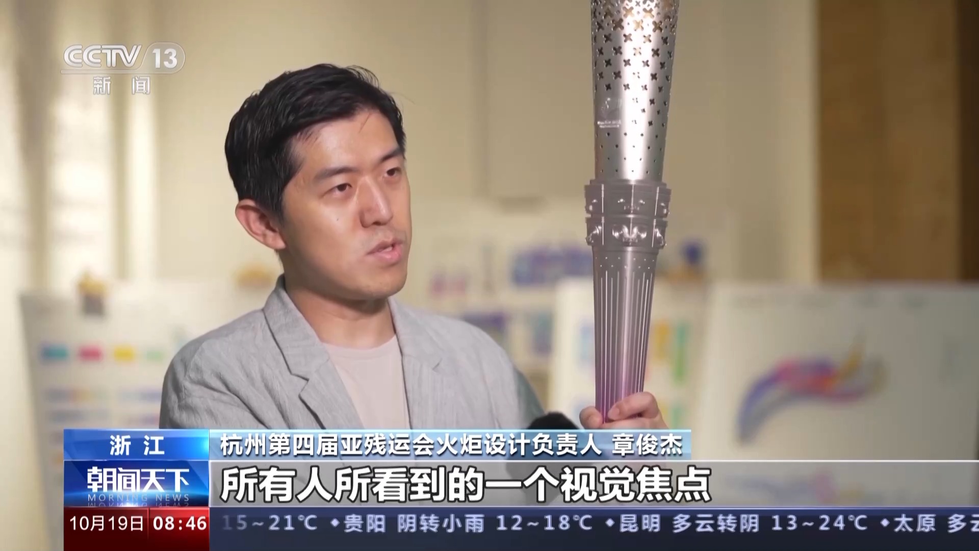 杭州第四届亚残运会火炬设计负责人 章俊杰:玉琮是实证中华五千年文明史的良渚遗址文明当中的一个重要礼器。我们把玉琮作为一个核心意象,外方内圆作为我们在举起火炬的时候所有人所看到的一个视觉焦点。玉琮承上启下,它分别代表了不同的寓意。承上我们用点点的星光汇聚成桂花的桂冠,可以看到我们的星光越来越稠密,这是我们希望去体现整个火炬设计它的积极向上的那种力量感。玉琮往下,在这个地方设计有几十条的科技线,它就好像是绵延着我们人类的历史和我们城市科技的一个脉络。